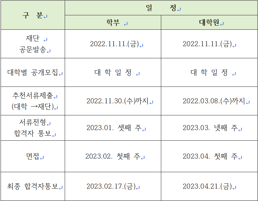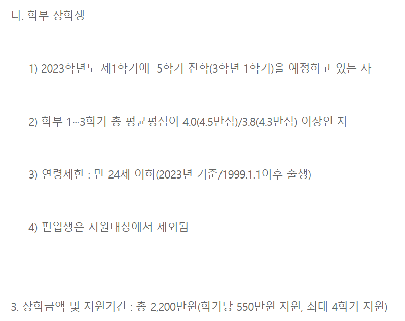 우연히 발견하게 된 장학 공지였다. 다른 장학재단과 다른 점은 소득분위를 보지 않는다 + 요구하는 학점의 기준이 높다는 것이 특징이었다. 그리고 공고를 올린 후 제출할 수 있는 기간이 딱 2주였기에 미리 이 장학재단에 대해 알지 못하고 있었다면 준비하기에 빠듯한 편이었던 것 같다.(필자는 우연히 발견했기에 사실상 2주도 안되는 시간 동안 서류를 준비해야 했다.)