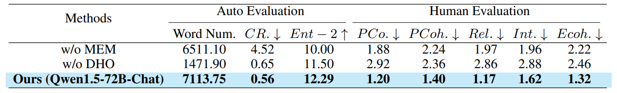 Similarly, we remove the MEM to eliminate the knowledge graph for reference and resort to the multi-round chatting capability of LLM to generate content. Limited by computing cost, we set the maximum chat rounds to 2. As shown in Table 2, the conflict rate significantly increases from 0.56 to 4.52 and Ent-2 reduces from 12.29 to 10.00 without MEM. Additionally, all human evaluation metrics deteriorate to varying degrees. These results indicate that MEM ensures contextual coherence by providing relevant content during generation, which also improves plot coherence and alignment with human preferences. See the example of MEM in Appendix E.