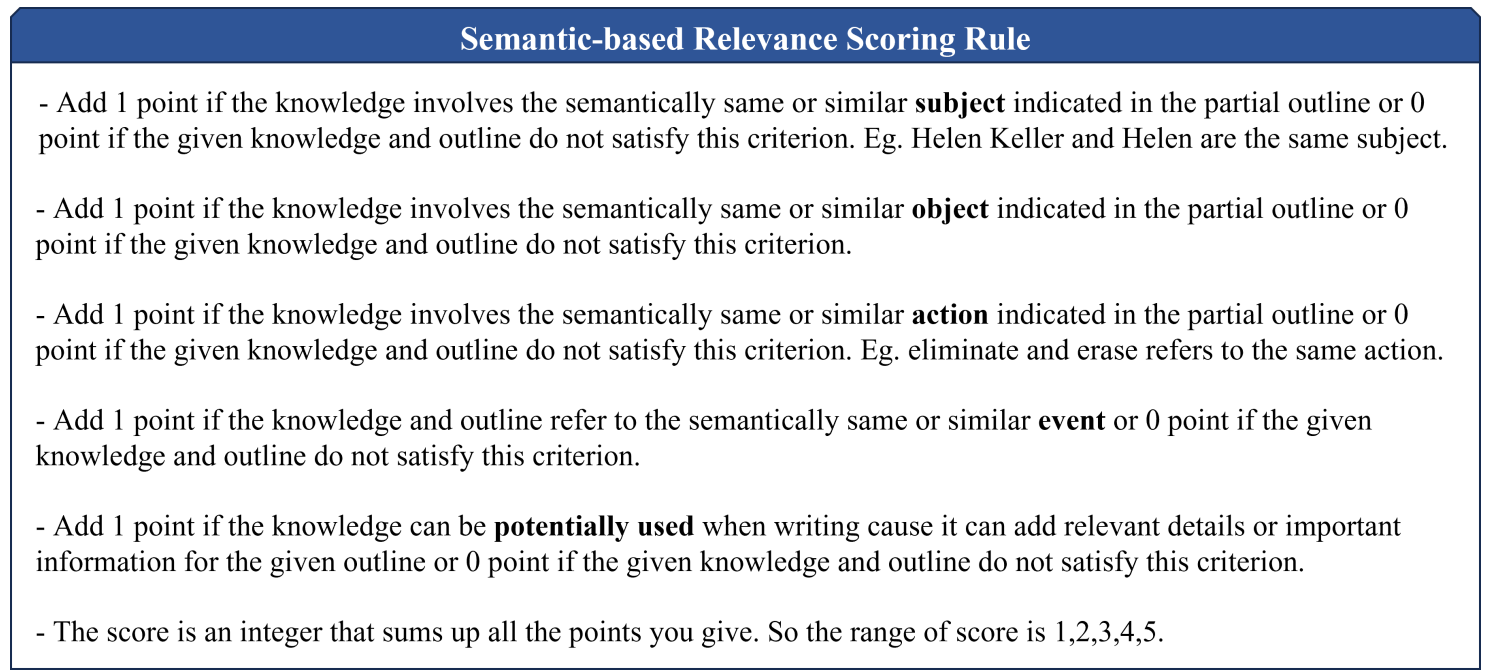 - Since LLm-as-a-judge has been verified by experiments (Zheng et al., 2024) and it can evaluate some features of a text within a certain length according to rules (Achiam et al., 2023; Liu et al., 2021),