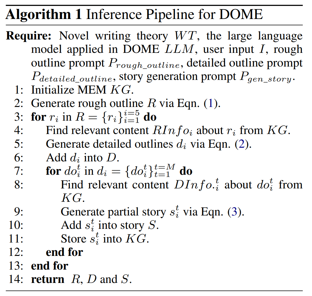 - DOME = Dynamic Hierarchical Outline (DHO) + Memory-Enhancement Module (MEM) = to generate long-form story.