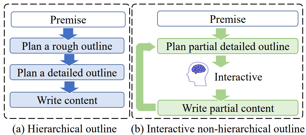 - (b) generating content progressively without outlining based on human interaction and relevant preceding content (Zhou et al., 2023; Brahman et al., 2020)