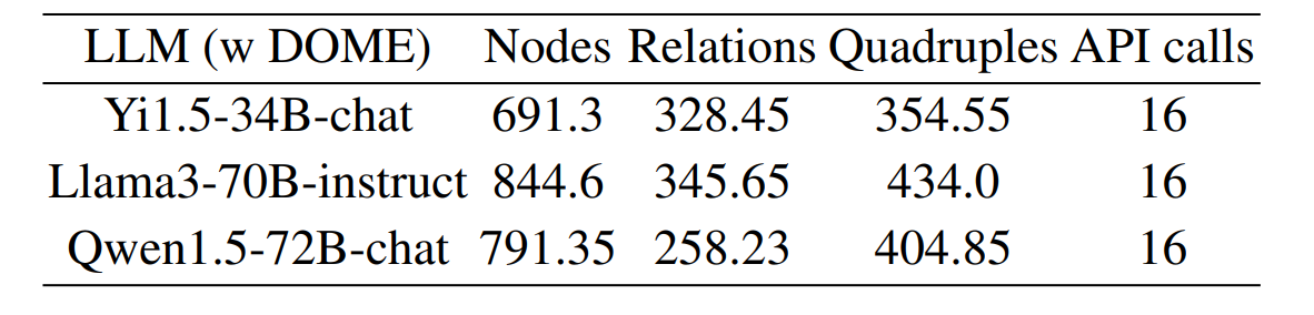 - 구체적으로, Table 1과 3에서 볼 수 있듯이, 제안된 DOME은 KG를 동적으로 구축하는 과정에서 791개의 노드 저장 오버헤드와 16회의 LLM API 호출만 추가하지만, 모든 성능 지표에서 최신(SOTA) 방법들을 능가한다.