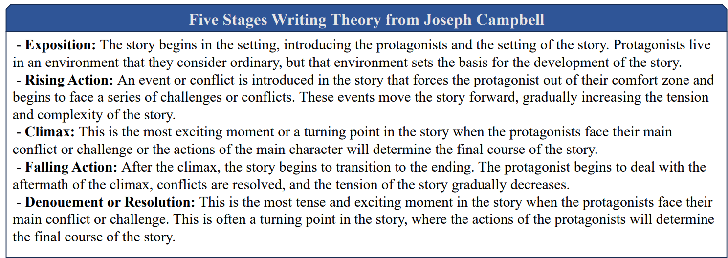 - to guide long-form story generation based on the plan-write writing framework + the novel-writing theory (Campbell, 1949).
