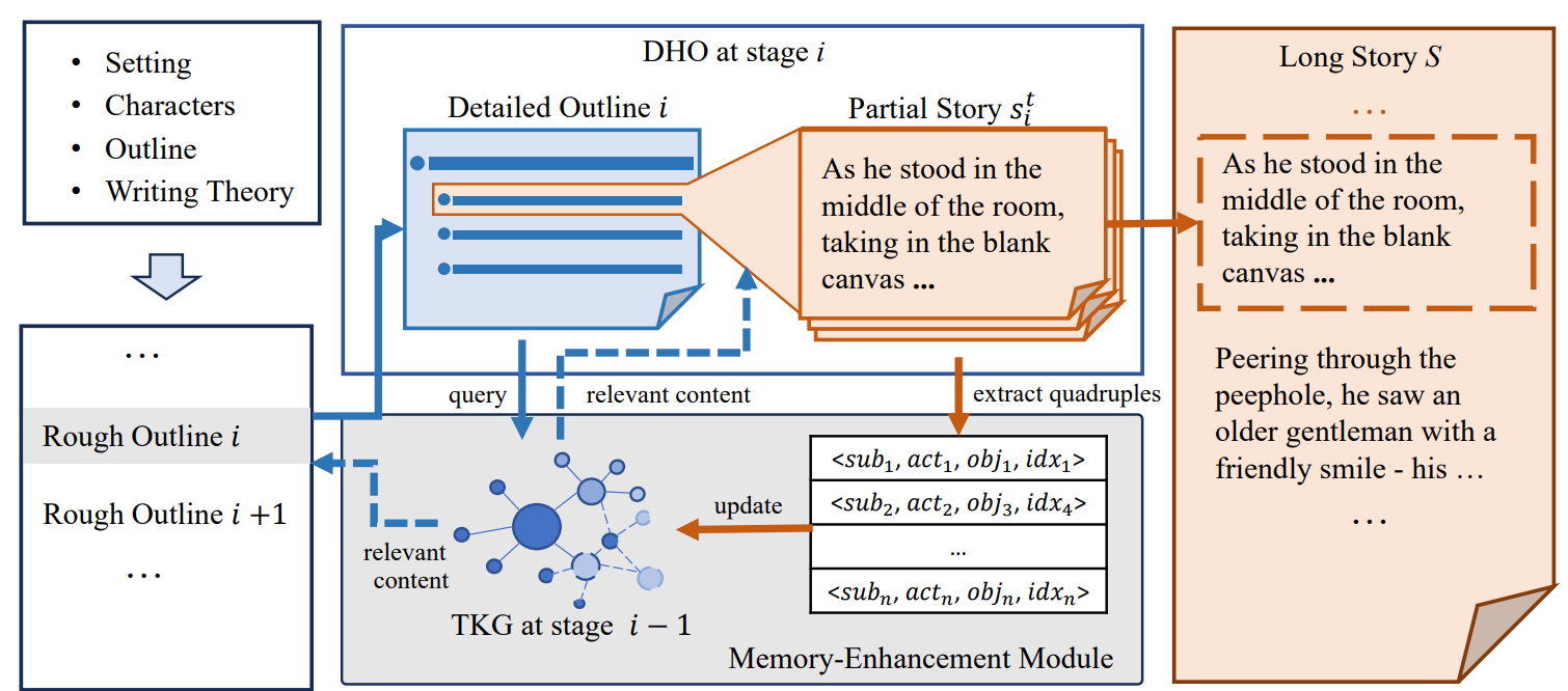 - Additionally, the Memory-Enhancement Module (MEM) uses temporal knowledge graphs to store and access generated stories, providing contextual content for both detailed outline planning and story writing, and reducing contextual conflicts.