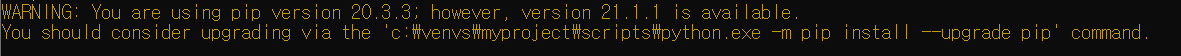 WARNING: You are using pip version 20.3.3; however, version 21.1.1 is available. You should consider upgrading via the ‘c:\venvs\myproject\scripts\python.exe -m pip install --upgrade pip’ command.
